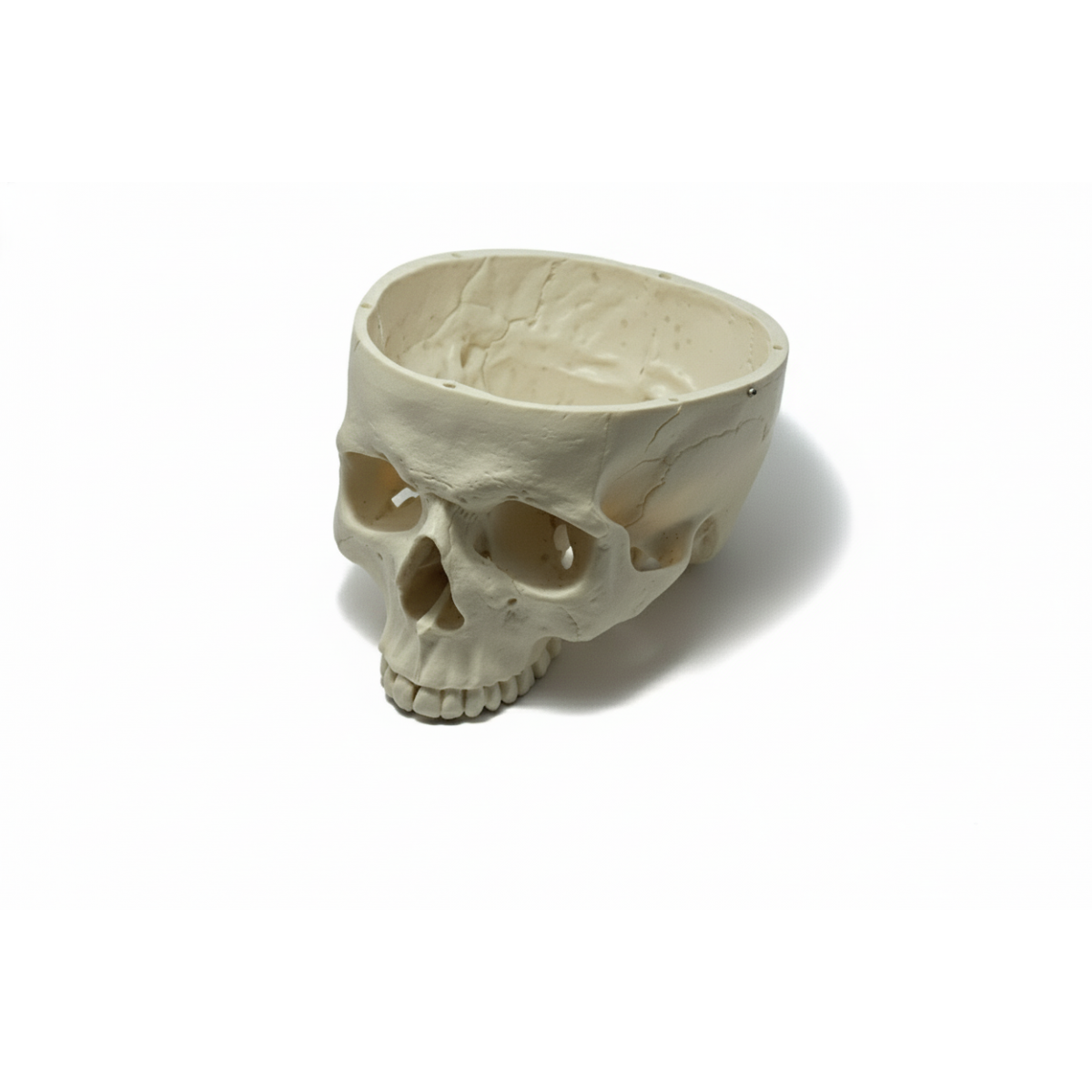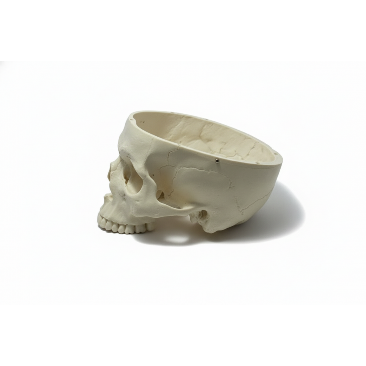 Cast from an anatomically accurate adult skull, this one-piece model shows the cranial base and facial bones in crisp detail, with the calvaria permanently removed for an open view of the cranial cavity.